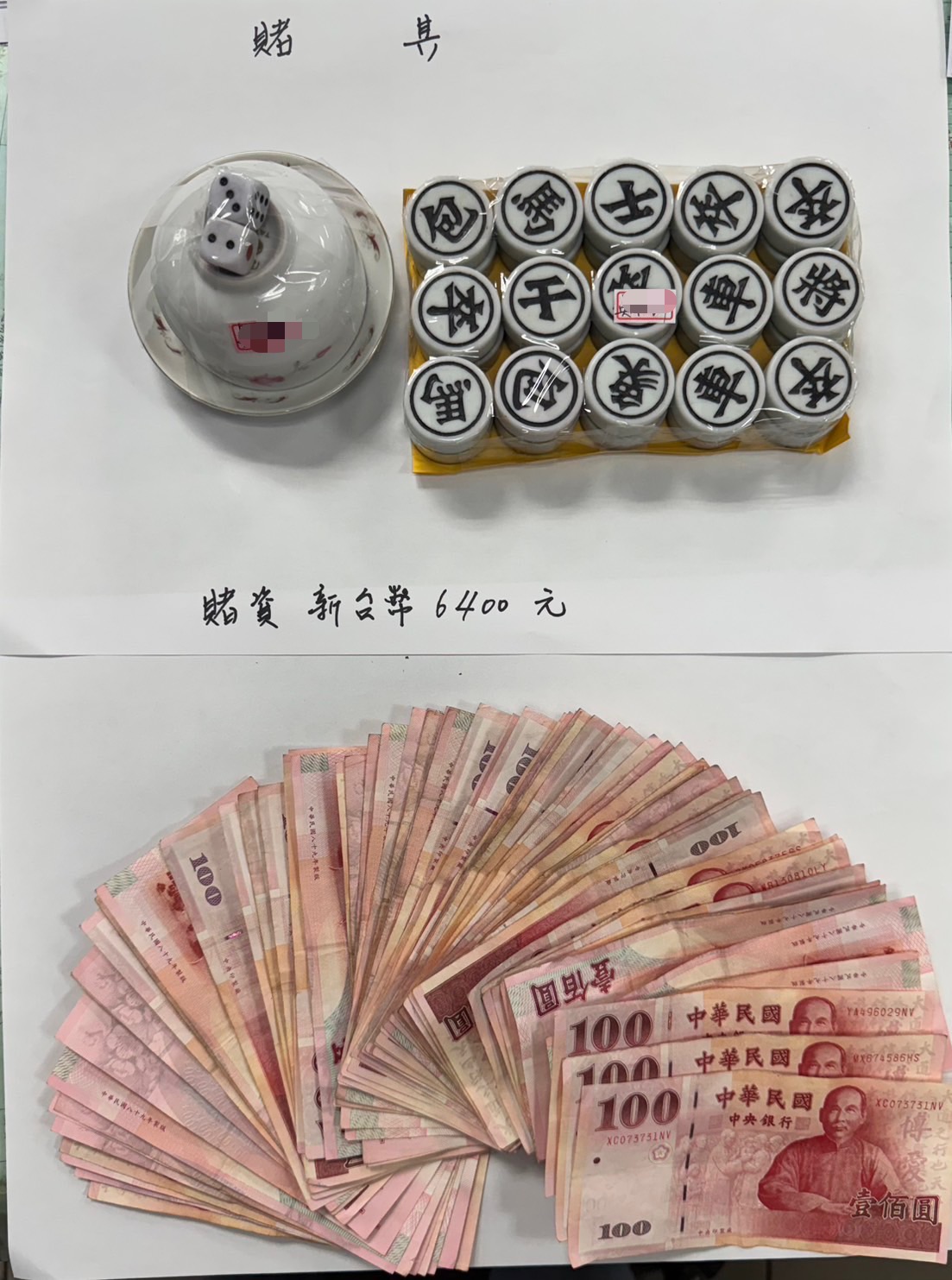 日前警方獲線報稱在屏東市公園常有多名人員從事賭博行為,經屏東警分局探訪人員前往蒐證埋伏,於本(2)月10日16時30分許查獲包含莊家吳男及賭客等7名,現場以骰子、象棋等賭具把玩俗稱「三六仔」之賭博,現場查扣賭資共計新台幣6,400元、骰子2顆、骰盅1組、象棋30顆等證物,全案依賭博罪偵辦。